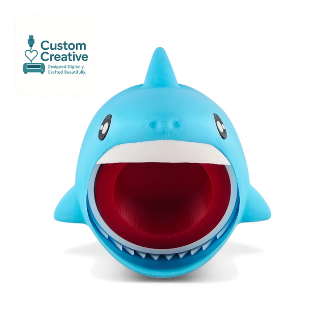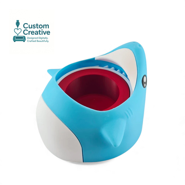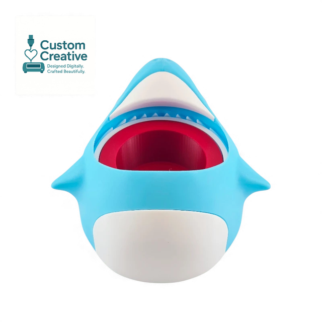 Made from durable PLA and designed to look like a cute, chubby shark with a big bite.